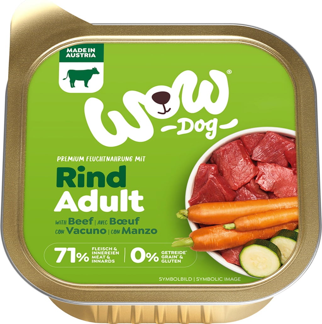 ADULT – Bœuf, Carotte + Courgettes de WOW est un menu complet pour chiens adultes de toutes races et de toutes tailles. Il contient 71 % de viande et est enrichi de légumes et d’herbes aromatiques de haute qualité. L’aliment est entièrement dépourvu de céréales, de sucres ajoutés, d’arômes et de conservateurs.