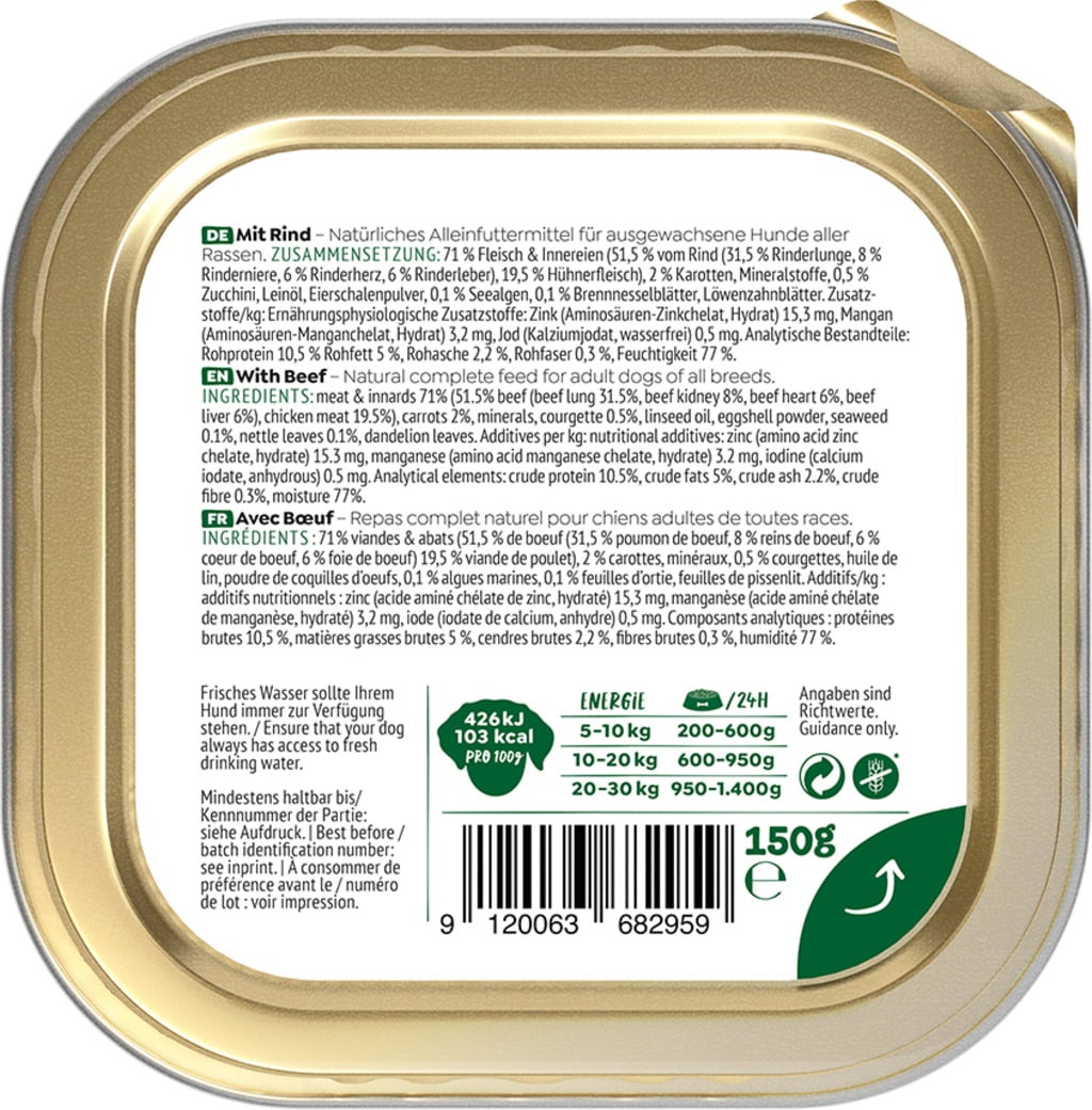 71 % viandes et abats (51,5 % boeuf (31,5 % poumon de boeuf, 8 % rognon de bœuf, 6 % coeurs de boeuf, 6 % foie de boeuf), 19,5 % viande de poulet), 2 % carotte, Mineralstoffe, 0,5 % courgette, Leinöl, poudre de coquilles d'œufs, 0,1 % Seealgenpulver, 0,1 % feuilles d'ortie, feuilles de pissenlit