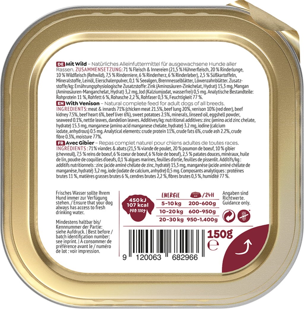 71 % viandes et abats (21,5 % viande de poulet, 20 % poumon de boeuf, 10 % viande de gibier (chevreuil)), 7,5 % rognon de bœuf, 6 % coeurs de boeuf, 6 % foie de boeuf, 2,5 % patate douce, Mineralstoffe, Leinöl, poudre de coquilles d'œufs, 0,1 % Seealgenpulver, feuilles d'ortie, feuilles de pissenlit